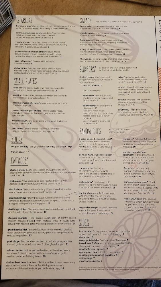 The menu at Bernie's blends comfort food with innovative twists. Starters like poutine and beer hall pretzels kick things off well. For brunch, patrons rave about the BYO omelet and Bernie's Benedict. Lunch and dinner highlight options like grilled petite filet and crab cakes, showcasing the kitchen's versatility.